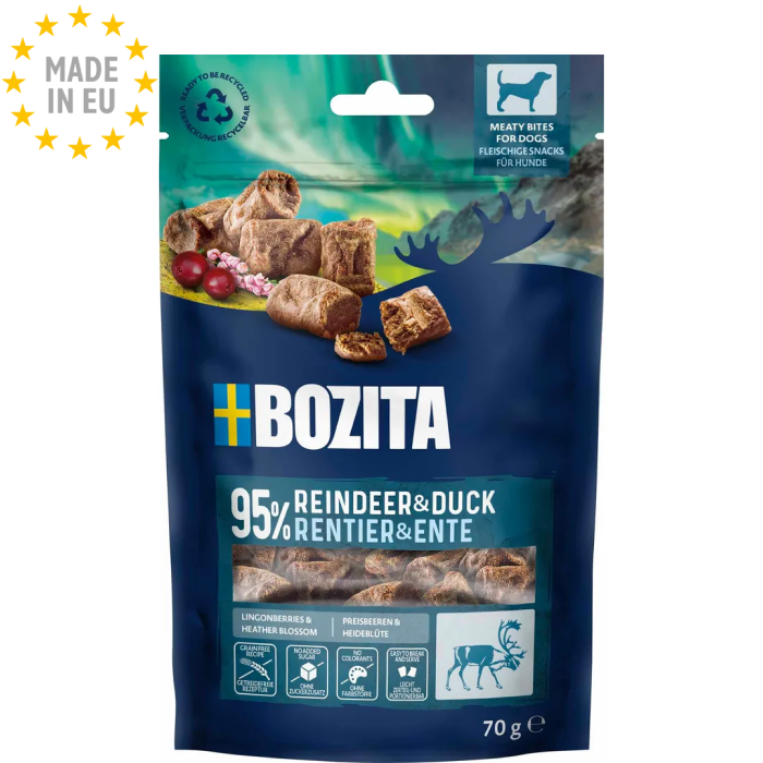 Forkæl din hund med de lækre og naturlige Bozita Meaty Bites, der kombinerer smagen af saftigt rensdyr og mør and.